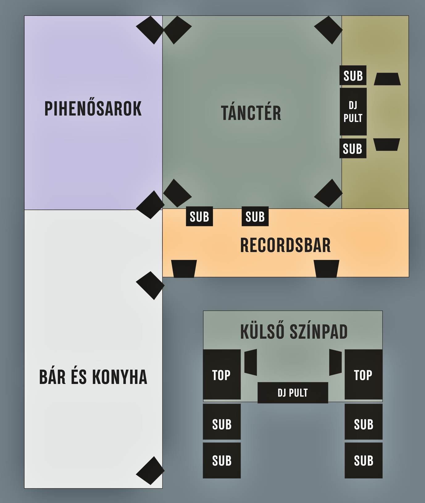 Minden esetben kizárólag a hely bérbeadója jogosult a hangtechnika bekapcsolására, a DJ-pult összeállítására, valamint az egyéb kapcsolódó összeköttetések kialakítására. Ennek megfelelően a rendszer használata során a felelősség is minket terhel, annak érdekében, hogy minden zavartalanul és biztonságosan működjön.